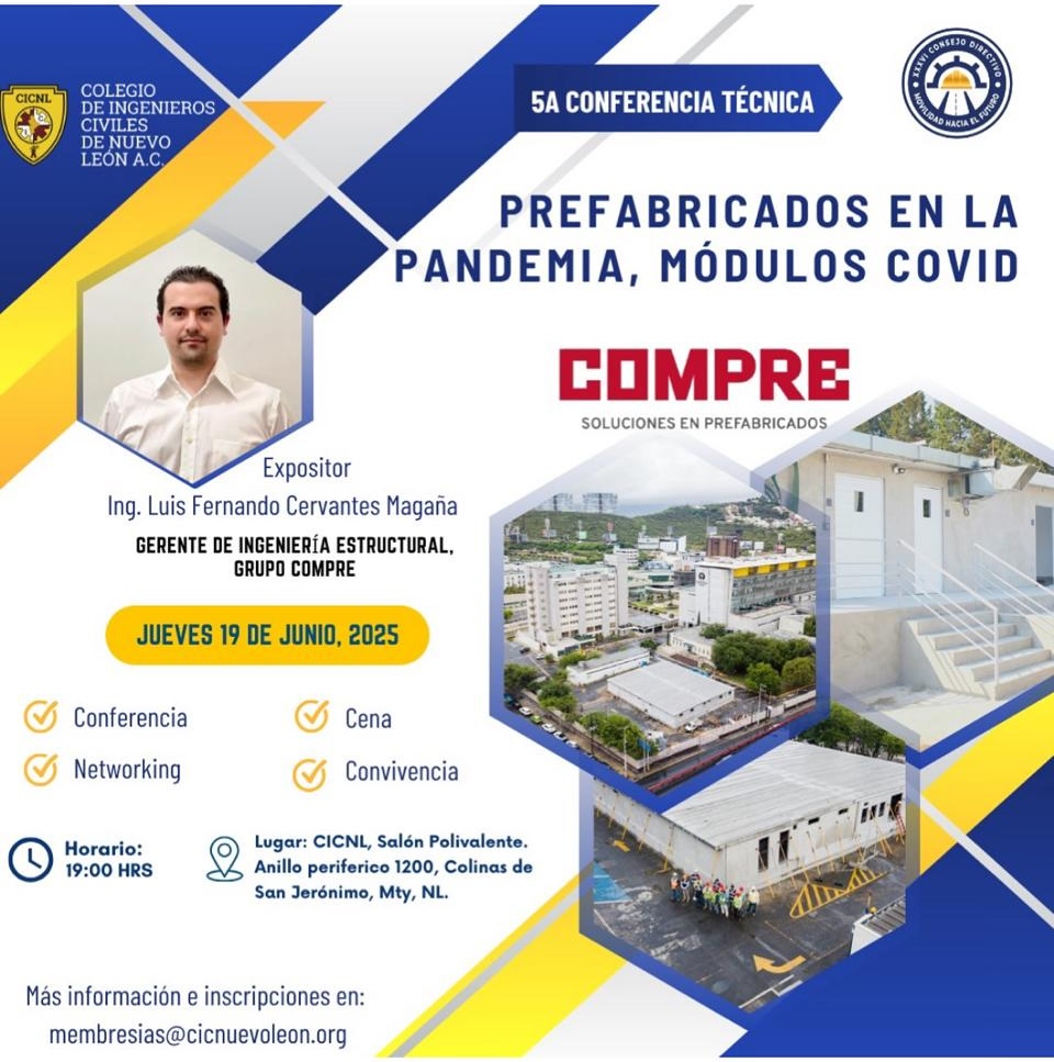 Acompáñanos en esta conferencia donde el Ing. Luis Fernando Cervantes Magaña, Gerente de Ingeniería Estructural de Grupo COMPRE, compartirá cómo los sistemas prefabricados jugaron un papel clave durante la pandemia con la implementación de módulos COVID. Una charla inspiradora sobre ingeniería, adaptación y soluciones eficientes en momentos críticos.